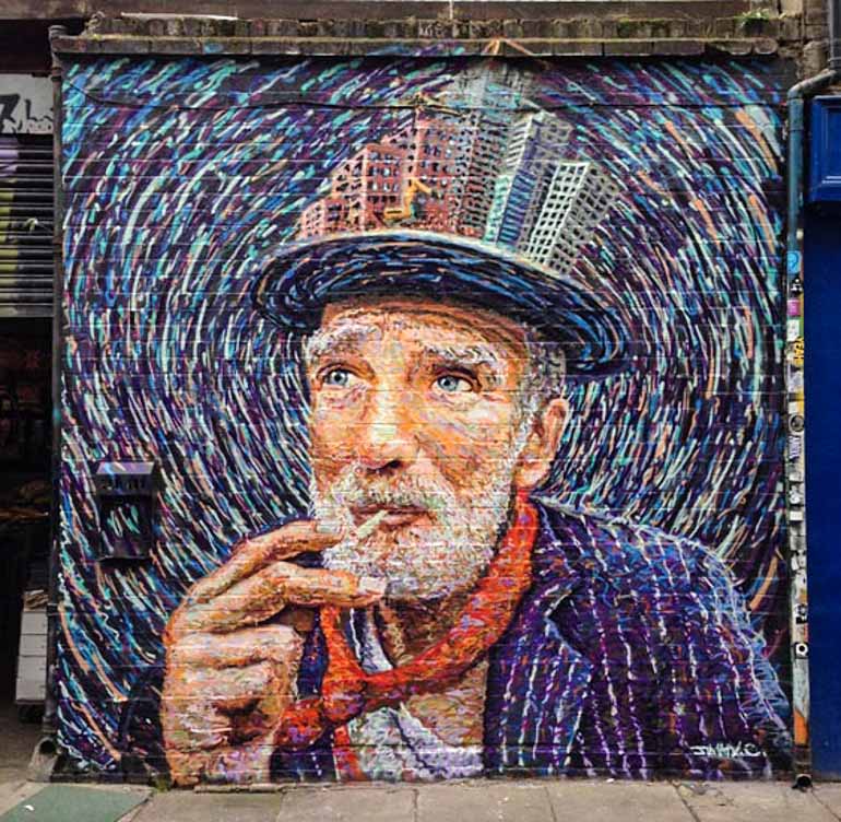 In 2010 Jimmy moved to London, and now splits his time between canvas work in the studio and large-scale murals on walls all over the world. His pointillist style (image creation using dots) has garnered him an international reputation, with recent public works adorning iconic locations in Miami, Berlin, Barcelona, Paris, Sao Paolo, Lisbon, Birmingham, Montpellier and London. Jimmy’s work on canvas is done in his trademark style using spray cans, and is exhibited in galleries and sold to private collectors.